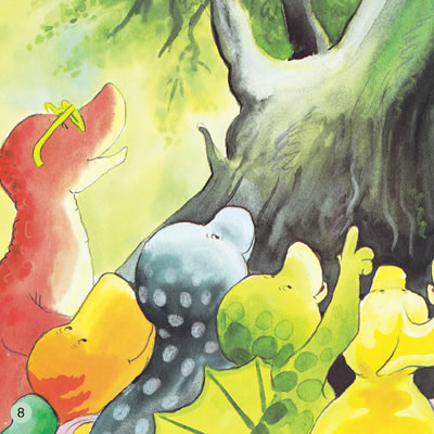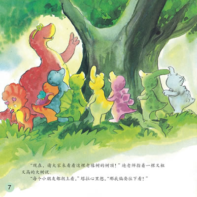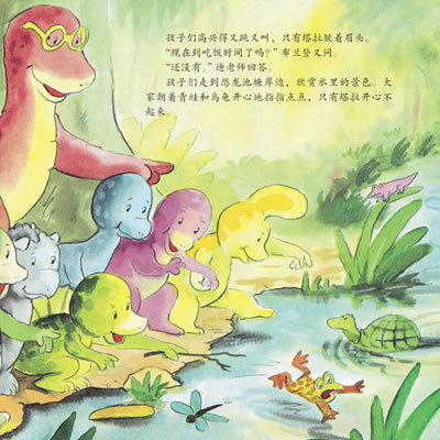 值得注意的是,在系列图画书中,作者有意轻描淡写爸爸妈妈的形象,真正的主人公只有一群可爱小恐龙和他们和蔼、睿智的迪老师。这正是系列图画书的独具智慧之处:帮助我们的孩子在离开爸爸妈妈的时候,学会自己解决问题,培养真正独立的人格、积极的心态和快乐的心情。