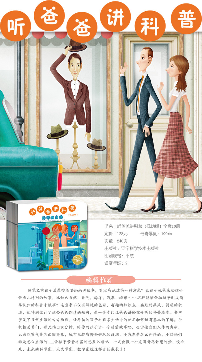 睡觉之前孩子总是吵着要妈妈讲故事,有没有试过换一种方式?让孩子他爸来给孩子讲点儿特别的故事,比如大自然,天气,海洋,汽车,城市…… 这样能够帮助孩子形成简单认知的科普小故事?这套书不仅有鲜艳的色彩,有趣的知识点,幽默的画风,简明的叙述,还特别设计了适合爸爸朗读的短句,是一套专门让爸爸讲给孩子听的科普绘本。书中涉及了日常生活的方方面面,让年幼的孩子对日常生活中的物品和常识有基本的了解。手机控爸爸们,每天抽出10分钟,给你的孩子讲一个睡前故事吧,告诉他我们人体的奥秘,大自然节气是怎么回事儿,城市里都有哪些好玩的设施,小汽车是怎么开动的,小动物们都是怎么生活的......让孩子带着丰富的想象入睡吧,一定会做一个充满奇思妙想的梦,没准儿,未来的科学家、天文学家、数学家就这样开始成长了!