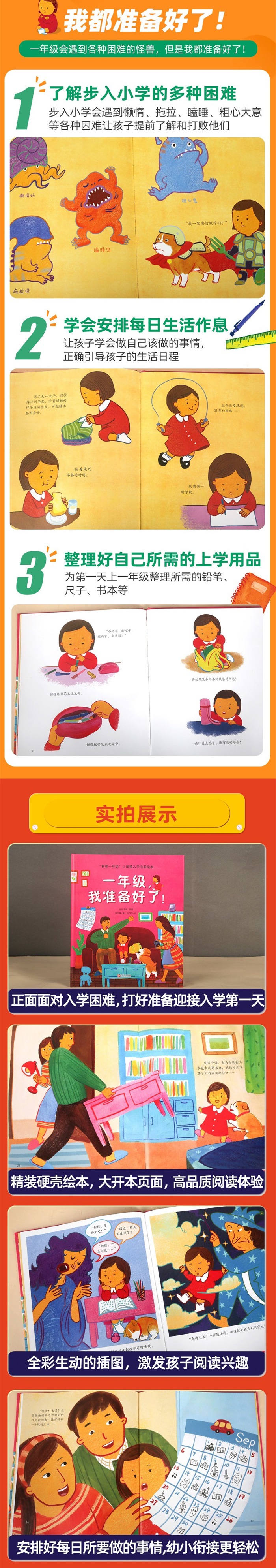 ★ 儿童教育名师何捷老师主编,引导孩子发现课堂乐趣 儿童教育名师何捷老师数十年的一线教学经验,了解关注儿童心理发展,深谙如何激发孩子的学习兴趣,让孩子爱上学习、快乐学习。与李文静老师一起创作了这本帮助孩子了解小学课堂的趣味绘本,帮助孩子发掘上课的乐趣! ★ 做好8项入学准备,快速适应小学生活 入学准备如何具体施行?怎样调节心态,面对学习过程中的拦路虎?怎样规划一天的时间,提高学习效率,事半功倍?该购买哪些学习用品,让学习过程如虎添翼……这些问题,在阅读这本有趣的绘本后,你将得到解答。