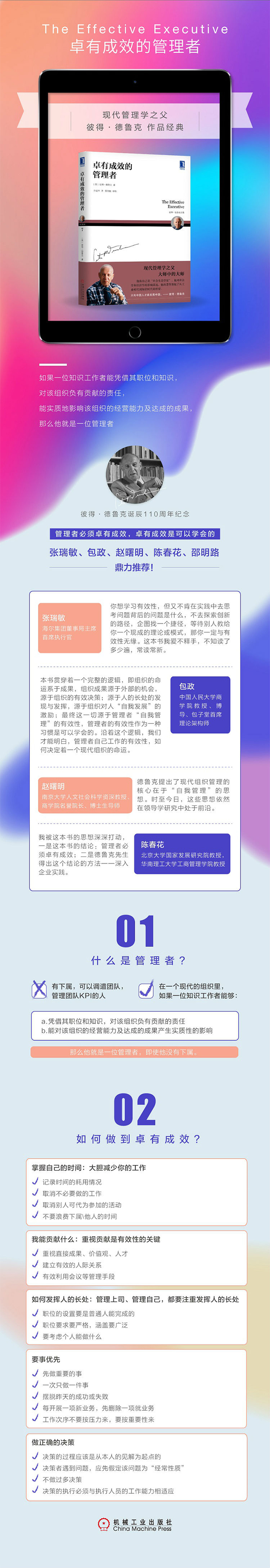 卓有成效是管理者必须做到的事,但是在所有的知识组织中,每一位知识工作者其实都是管理者——即使他没有所谓的职权,只要他能为组织做出突出的贡献。 管理者的成效往往是决定组织工作成效的最关键因素;并不是只有高级管理人员才是管理者,所有负责行动和决策而又有助于提高机构工作效能的人,都应该像管理者一样工作和思考。 本书中,德鲁克集中论述了一个管理者如何做到卓有成效。这本书是德鲁克最著名的管理学著作之一,倾注了德鲁克极大的心血。一位卓有成效的管理者,一般具有以下6个特征:(1)重视目标和绩效;只做正确的事情。(2)一次只做一件事情,并只做最重要的事情。(3)作为一名知识工作者,他知道自己所能做出的贡献。(4)在选用高层管理者时,他注重的是出色的绩效和正直的品格。(5)他知道增进沟通的重要性;他有选择性地搜集所需要的信息。(6)他只做有效的决策。