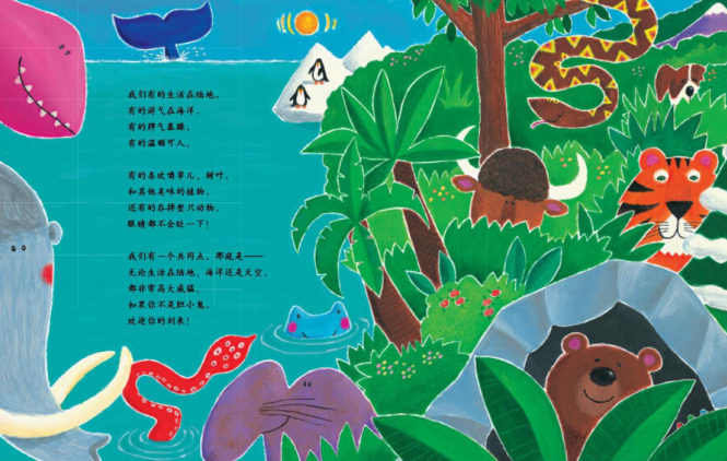 书中介绍了恐龙、海洋动物、大动物、小动物、丛林动物、农场动物、小狮子的故事。以诗歌的形式,介绍各种动物的特征、名称。文字幽默风趣,画面有大大的视野、夸张的表现形式。