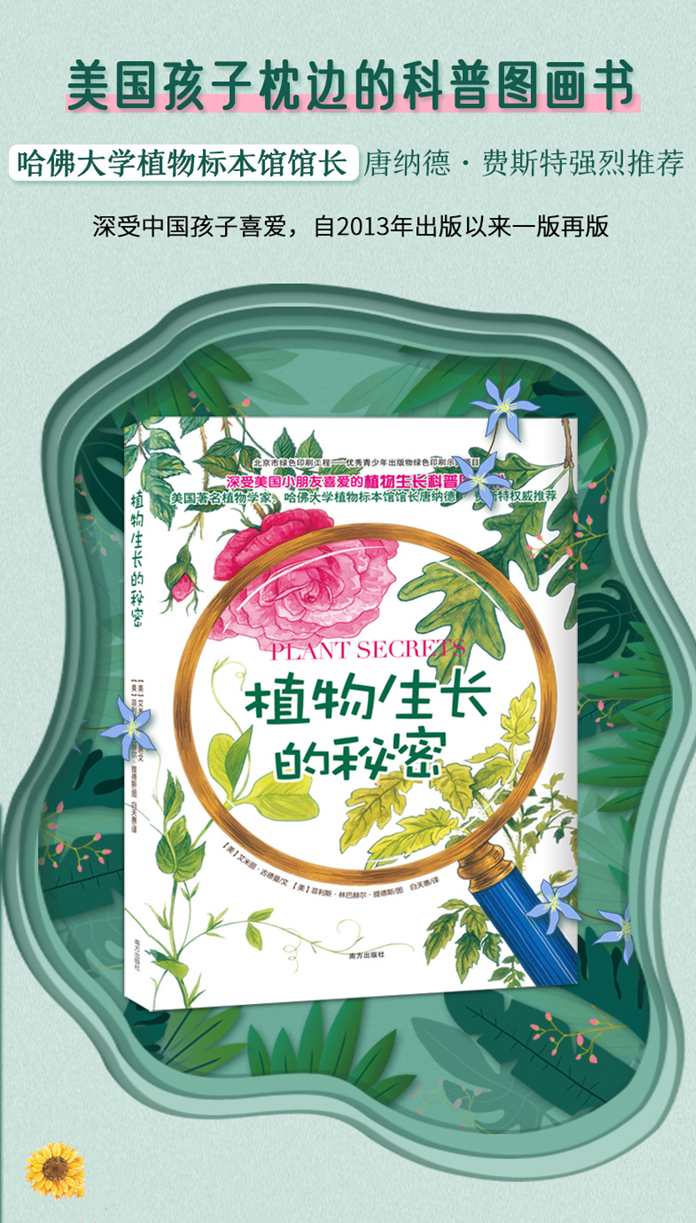 《植物生长的秘密》是深受美国小朋友喜爱的植物生长科普图画书。用精美绝伦的全彩图画展示植物循环的秘密。读完这本书,小朋友们将会以一种全新的视角去看待植物以及植物的生长过程。 哈佛大学植物标本馆馆长推荐。 2. 学校图书馆杂志、美国图书馆协会联袂推荐。 3. 美国排名前9位的常青藤院校达特茅斯学院艺术指导亲配插画。 4. 入选北京市绿色印刷工程——优秀青少年出版物绿色印刷示范项目。