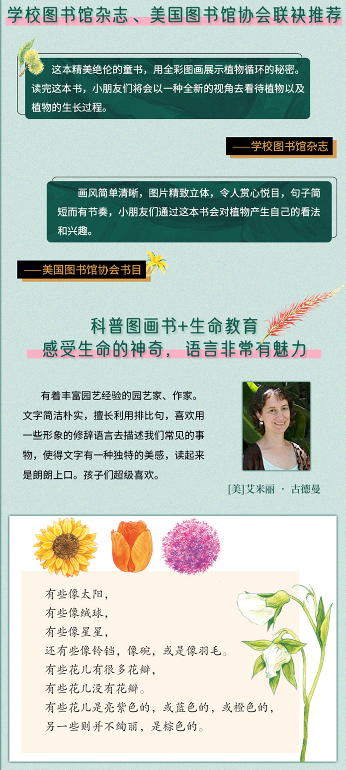 这本精美绝伦的童书,用全彩图画展示植物循环的秘密。读完这本书,小朋友们将会以一 种全新的视角去看待植物以及植物的生长过程。 ——学校图书馆杂志 画风简单清晰,图片精致立体,令人赏心悦目,句子简短而有节奏,小朋友们通过这本书会对植物产生自己的看法和兴趣。 ——美国图书馆协会《书目》