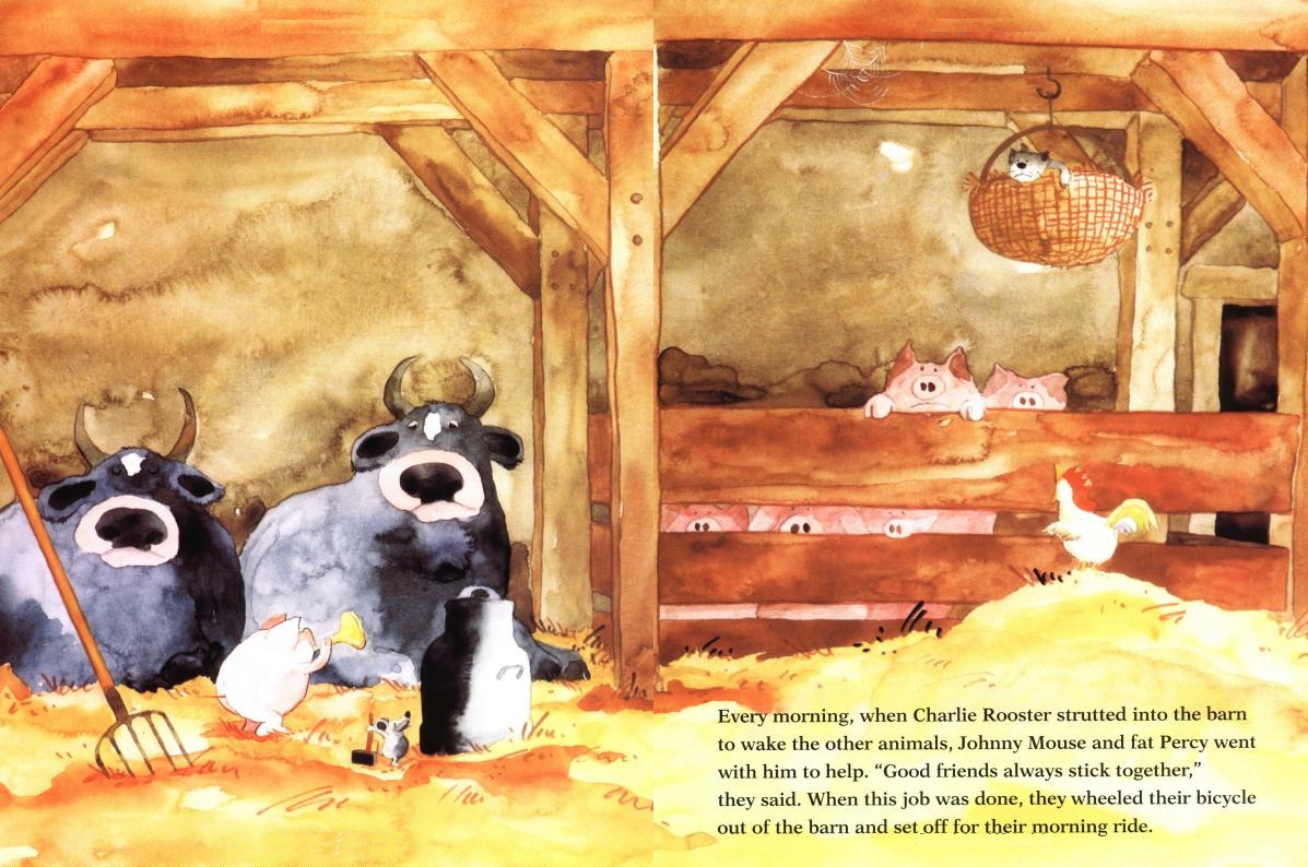 Charlie Rooster, Johnny Mouse, and Percy the pig are the best of friends. They do everything together. They ride their bike together, play games together, and even do their chores together. Because that's what good friends do. When night falls, though, and it's time to go to bed, they learn that sometimes friends have to be apart. But that's okay, because true friends always find each other, even if it's just in their dreams.