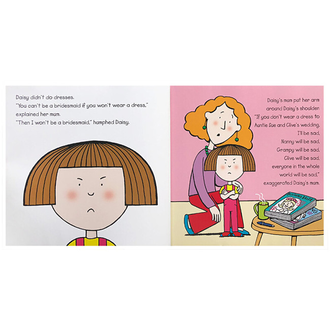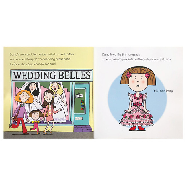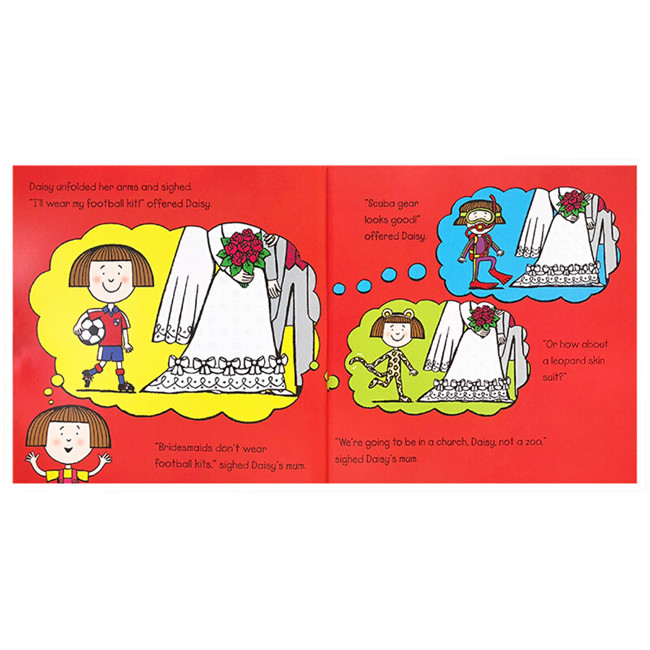 Daisy的阿姨Sue要结婚啦,Daisy要做伴娘。可是Daisy不喜欢穿裙子,她想穿足球服,潜水衣或者打扮成豹子一样。于是妈妈和阿姨将Daisy带到婚庆店,试了好多套礼服,Daisy都不喜欢,她和妈妈和阿姨达成协议要穿自己设计的裙子,到底Daisy当天会穿什么样的裙子出场呢?