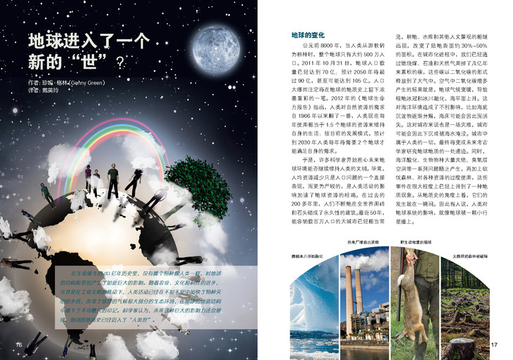 “人类世”刻画了一个人类活动改变地球的时代:人口过度增长打破了地球的供需平衡;大城市的涌现破坏了天然地貌;二氧化碳和甲烷的增多改变了地球的气候;森林破坏和环境污染威胁着动植物的生存;过量攫取能源正在“榨干”地球的最后一滴“血”……