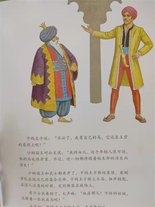 故事讲述了老巫师向国王献上一匹会飞的木马,并且要求国王将公主嫁给他。卡玛王子上前阻止,老巫师怀恨在心,让王子骑着木马飞向太阳。王子操纵木马来到沙纳王国境内,爱上了美丽的沙纳国公主。经过国王的重重考验,卡玛王子带着沙纳国公主回到自己的国家,不料公主被老巫师骑着木马骗走,并强迫公主嫁给他。猎人罗姆国王及时救出了公主,也想要公主嫁给他,公主无奈之下只得装病,卡玛王子假扮成医生去到罗姆国王那儿,拿回了木马,救出公主,带着公主回到了自己的国家,从此过上了幸福的生活。故事情节离奇有趣,充满想象力,生动有趣的情节和流畅的语言叙述,让孩子在阅读过程中很容易进入情境,体会想象创造的奇妙境界,并且意识到困境中要冷静沉着,哪怕阻挠重重,也要勇敢地追求属于自己的东西。
