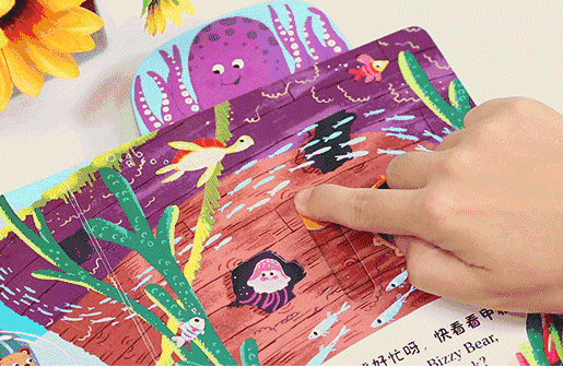 这套书是厚纸板游戏书,每本有不同的主题——海上冒险、太空遨游、参观恐龙园......不同的故事配上不同的互动操作页,宝宝的小手推一推、拉一拉、转一转、滑一滑就能看到意想不到的惊喜,既锻炼了小手的灵活性,又鼓励宝宝主动探索,这就是蕞好的早教。文字也是本书的一大特色,在亲子阅读的时候,可以哼唱朗朗上口的中英歌谣,是孩子蕞初的英语启蒙利器。英国上市一个月就冲进了低幼书的前十名,好评如潮!