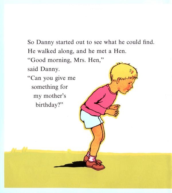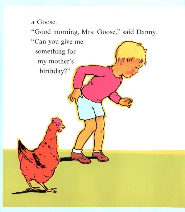 Trying to find the perfect birthday present for his mother isn't easy for Danny. The hen offers eggs, the goose feathers and the sheep wool. But mother already has those things. Then the cow suggests that Danny go ask Mr. Bear. It's from him that Danny gets a special and unique gift for his mother.