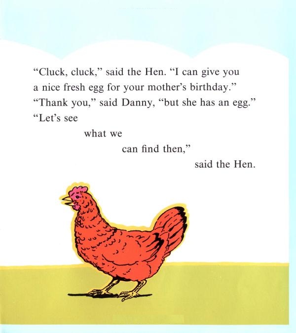 Danny searches for the perfect birthday present for his mother and learns that while hens give eggs, cows give milk, sheep give wool, geese give feathers, the best gift of all is a great big bear hug! A classic picture book, as lovely and loving as ever.