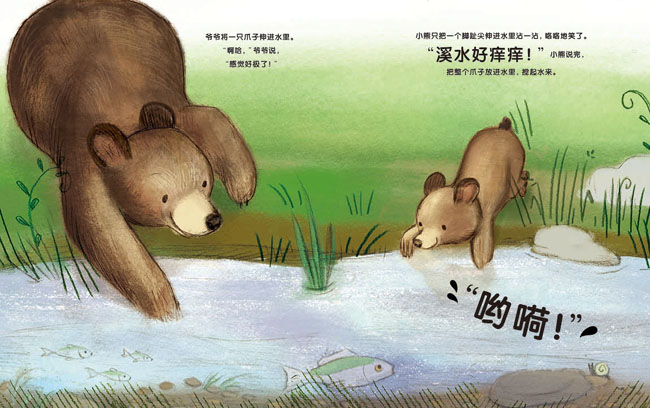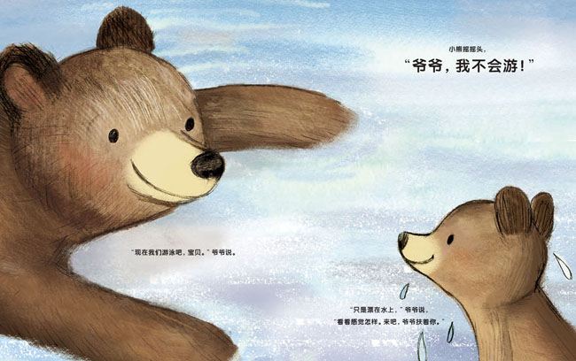 《爷爷和我去游泳》:小熊和爷爷到河边散步。爷爷让小熊伸出爪子放到水里,踢踢腿,打打水花……在爷爷的帮助下,小熊学会了游泳。他开心地说——我喜欢和爷爷一起游泳!我爱爷爷!