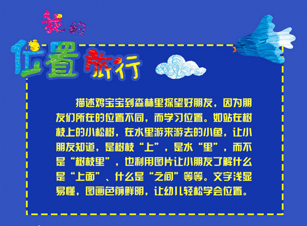 《我的位置旅行》描述鸡宝宝到森林里探望好朋友,朋友们所在的位置各不相同,如站在树枝上的小松鼠、在水里游来游去的小鱼等。让小朋友认识到,是“树枝上”、是“水里”,而不是“树枝里”、“水上”,也利用图画让小朋友了解什么是“上面”、什么是“之间”等等。文字浅显易懂、绘图色彩鲜明,让小朋友轻松学会辨认位置。