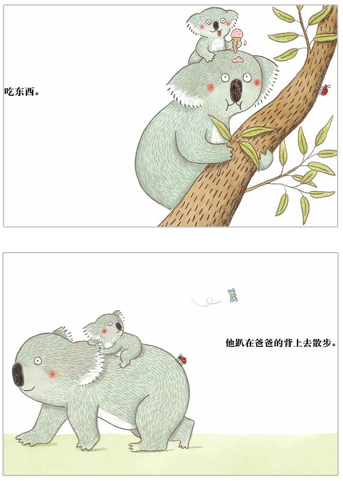 ★ 呆萌可爱又智慧的无尾熊爸爸,陪伴、放手都是爱。 有一只非常呆萌可爱的小无尾熊,每天都幸福地跟爸爸黏在一起——在爸爸背上吃东西,在爸爸背上玩球,一不小心还会在爸爸背上尿尿,于是爸爸驮着他去洗澡澡…… 有一天,一只可爱的蝴蝶飞过,吸引了小无尾熊,他心里在想什么了呢?还在牙牙学语的他,该怎么告诉爸爸自己的心愿呢?爸爸又会怎么回应他呢?