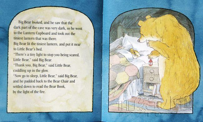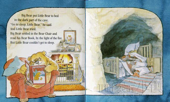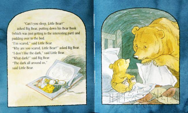 森林里住着两只熊,一只叫大大熊,一只叫小小熊。白天,他们一起玩;晚上,大大熊领着小小熊回到熊熊洞里。但是小小熊睡不着,因为他怕黑,大大熊为他点上盏小灯。可小小熊还是睡不着,还是怕黑。大大熊为他点上大一点的灯最后连灯王都点上了,但小小熊还是说怕黑——熊熊洞外的黑。这下大大熊可就为难了,因为就算把全世界的灯都点亮也照不亮外面世界的黑呀。怎么办呢?最后,大大熊牵着小小熊到熊熊洞外,大大熊抱着小小熊,面对外头漆黑的夜晚,只见星月当空,温柔如水的月光下,小小熊竟自然而然地在大大熊温暖、安全的怀抱里心满意足地睡着了……