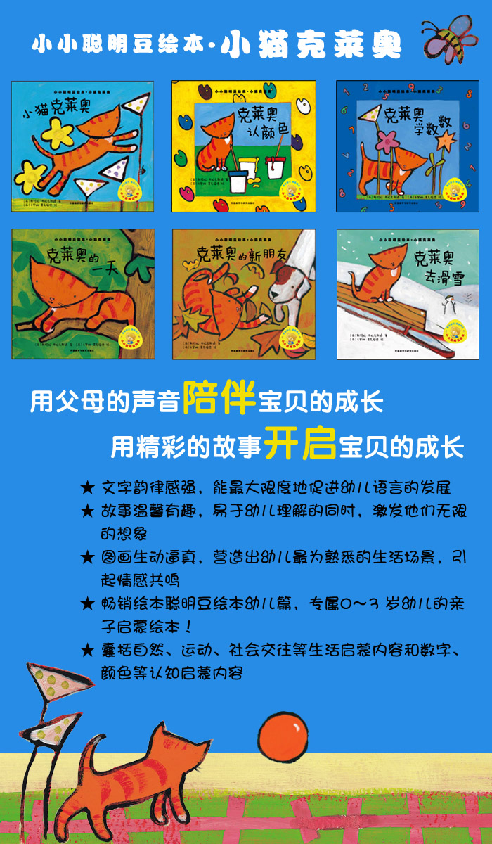 “小猫克莱奥”系列是“小小聪明豆绘本”中的子系列,专为0~3 岁宝宝量身打造的亲子启蒙绘本。书中文字韵律感十足,宝贝听着带劲儿;图画生动简洁,宝贝看着舒服;并从宝贝耳熟能详的日常生活入手,引入认知内容。这套亲子启蒙绘本,旨在让宝贝从您的朗读声中,感受到亲子阅读的美好,迈出感知世界的**步。