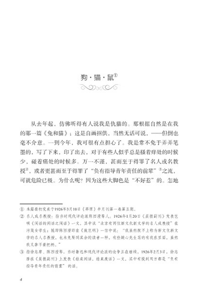 现在说起我仇猫的原因来,自己觉得是理由充足,而且光明正大的。第一,人的性情就和别的猛兽不同,凡捕食雀鼠,总不肯一口咬死,定要尽情玩弄,放走,又捉住,捉住,又放走,直待自己玩厌了,这才吃下去,颇与人们的幸灾乐祸,慢慢地折磨弱者的坏脾气相同。第二,他不是和狮虎同族的么?可是有这么一副媚态!但这也许是限于天分之故罢,假使他的身材比现在大十倍,那就真不知道他所取的是怎么一种态度。然而,这些口实,仿佛又是现在提起笔来的时候添出来的,虽然也像是当时涌上心来的理由。要说得可靠一点,或者倒不如说不过因为他们配合时候的嗥叫,手续竟有这么繁重,闹得别人心烦,尤其是夜间要看书,睡觉的时候。当这些时候,我便要用长竹竿去攻击他们。狗们在大道上配合时,常有闲汉拿了木棍痛打;我曾见大勃吕该尔(P.Bruegeld.)的一张铜版画AllegoriederWollust上,也画着这回事,可见这样的举动,是中外古今一致的。自从那执拗的奥国学者弗罗特(S.Freud)提倡了精神分析说——Psychoanalysis,听说章士钊先生是译作“心解”的,虽然简古,可是实在难解得很——以来,我们的名人名教授也颇有隐隐约约,捡来应用的了,这些事便不免又要归宿到性欲上去。打狗的事我不管,至于我的打猫,却只因为他们嚷嚷,此外并无恶意,我自信我的嫉妒心还没有这么博大,当现下“动辄获咎”之秋,这是不可不预先声明的。例如人们当配合之前,也很有些手续,新的是写情书,少则一束,多则一捆;旧的是什么“问名”“纳采”,磕头作揖,去年海昌蒋氏在北京举行婚礼,拜来拜去,就十足拜了三天,还印有一本红面子的《婚礼节文》,《序论》里大发议论道:“平心论之,既名为礼,当必繁重。专图简易,何用礼为……然则世之有志于礼者,可以兴矣!不可退居于礼所不下之庶人矣!”然而我毫不生气,这是因为无须我到场;因此也可见我的仇猫,理由实在简简单单,只为了他们在我的耳朵边尽嚷的缘故。人们的各种礼式,局外人可以不见不闻,我就满不管,但如果当我正要看书或睡觉的时候,有人来勒令朗诵情书,奉陪作揖,那是为自卫起见,还要用长竹竿来抵御的。还有,平素不大交往的人,忽而寄给我一个红帖子,上面印着“为舍妹出阁”,“小儿完姻”,“敬请观礼”或“阖第光临”这些含有“阴险的暗示”的句子,使我不化钱便总觉得有些过意不去的,我也不十分高兴。