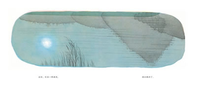 据说,尤里?舒利瓦茨创作这本图画书的灵感,来自于我国唐朝诗人柳宗元的《渔翁》。他画的是水彩,但却借用了中国水墨画晕染的技法。他从黎明前的第一道微光开始画起,不疾不徐,静中有动、动中有静地画出了黎明前湖光山色的微妙变化。