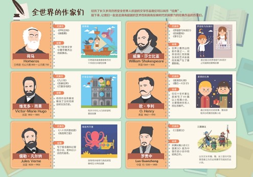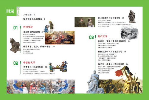本书以“世界文学”为主题,以漫画故事的形式向孩子们介绍了古典文学如“荷马史诗”“伊索预言”,中世纪文学如莎士比亚的《哈姆雷特》等;近代文学如笛福的《鲁滨逊漂流记》,格林兄弟的《花衣魔笛手》,雨果的《悲惨世界》,凡尔纳的《八十天环游地球》;现代文学如欧·亨利的《最后一片叶子》,圣埃克苏佩里的《小王子》。通过这些文学家和文学作品的介绍,孩子们可以了解到世界文学的丰富多彩,以及它们对人类文明的意义和影响,并从中了解到诗歌、寓言、童话、历史小说、科学小说、现实题材小说等等不同类别的文学体裁。