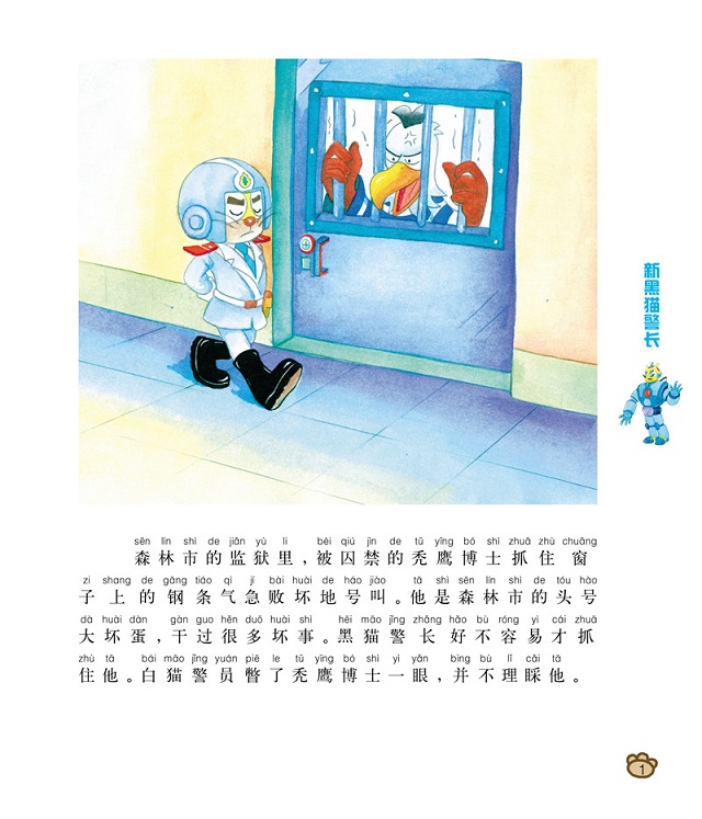 森林市的监狱里,被囚禁的秃鹰博士抓住窗子上的钢条气急败坏地号叫。他是森林市的头号大坏蛋,干过很多坏事。黑猫警长好不容易才抓住他。白猫警员瞥了秃鹰博士一眼,并不理睬他。