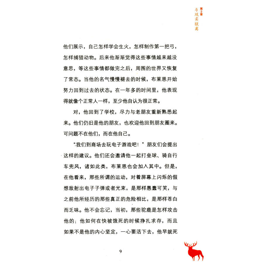 简单的情节并不影响故事的惊心动魄。盖瑞·伯森的《手斧男孩》系列已经触及到了青少年成长教育的深处,它通过对布莱恩野外成长历程的叙事,反映出布莱恩的思想和心理从幼稚走向成熟的变化过程。