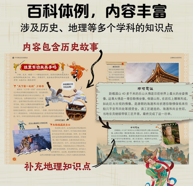 《不可思议的文明奇迹》是一本综合历史、地理等多学科知识的世界文化遗产百科书。全书收录了6大洲、30多个文明的101个世界奇迹。 其中,既有金字塔、空中花园等古代七大奇迹,也有长城、奇琴伊察等新七大奇迹。全书超过85%的奇迹收录于联合国《世界文化遗产名录》,其余为已经消失的或德国新天鹅堡等极富创造力的奇迹。 101个奇迹凝结着古人的智慧和想象力,是人类文明的代表和缩影,更有中华民族的骄傲,能满足或激起孩子的好奇心和想象力。
