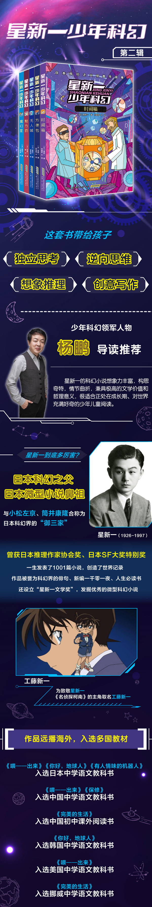 1 星新一被誉为“日本科幻之父”“日本微型小说的鼻祖” 2 中小学语文课外阅读推荐书目、作品用作语文阅读理解文章 3 从1001篇作品中精选出的经典,作品入围日本推理作家协会奖、直木奖 ,获日本星云奖特别奖、日本S-F大奖特别奖 4 中国少年科幻领军人物杨鹏作序推荐:很适合正处在成长期、对世界充满好奇的少年儿童阅读 4 《名侦探柯南》作者致敬的作家,日本销量过5000万册 5 星新一的《喂——出来》《保修》曾被收入八年级语文教科书;《豪华保险柜》《马戏团的秘密》用作2020浙江和四川语文中考阅读理解题 6 启发想象力,引导独立思考,激发阅读兴趣,培养写作能力