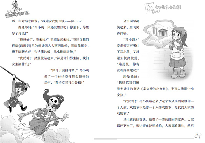 “我们可以成立一个剧团,马小跳可以做剧团的团长。” “我愿意!”马小跳想都不想就答应了,“牛皮,团长是干什么的?” “主要是管理。” “管导演和演员吗?” 牛皮不直接回答马小跳这个问题,却说:“团长要干的事很多,很辛苦的。” “我不怕辛苦。”马小跳踌躇满志地,“我们班要拿大奖,必须辛苦。” “我也不怕辛苦!”毛超说,“我当副团长,怎么样?” “我……也当……当副团长……” 毛超对张达说:“你话都说不利索,当什么副团长?” 马小跳为张达打抱不平:“张达唱歌的时候不结巴。” “他以前教我说中文的时候也不结巴,我还以为他是说得最好的。”牛皮一下子兴奋起来,“我有一个大胆的想象张达站在舞台上,他说台词的时候,也不结巴了……” 张达一点都不谦虚:“完全有……有这种可…… 能……” “言归正传。”这是牛皮跟马小跳他们几个说话的常用词,不然的话,他们又说远了,“我们要给剧团取一个名字。” 毛超想取“梦想剧团”,大家觉得“梦想”用得太多太滥,而且不着边际,显得空洞。