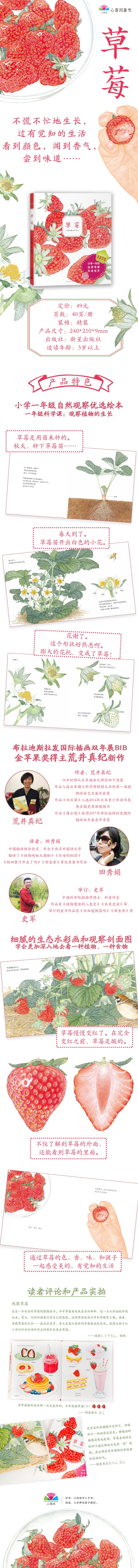 (1)布拉迪斯拉发国际插画双年展(BIB)金苹果奖得主荒井真纪新作 (2)小学一年级科学课自然观察优选绘本,帮助孩子理解草莓这种植物的生长 (3)通过展示草莓的色、香、味,和孩子一起感受美的、有觉知的生活 (4)细腻的水彩画和剖面图,让孩子学会更加深入地去看一种植物、一种食物 (5)适合3岁以上的孩子阅读,也适合与家长一起欣赏