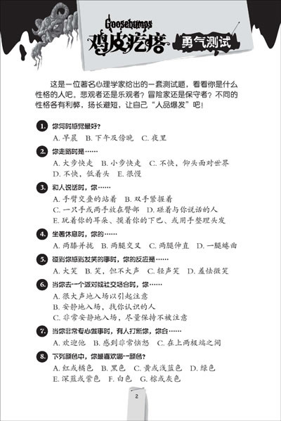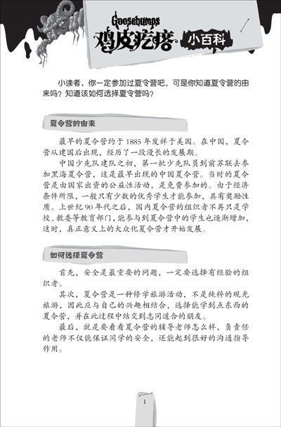 “勇气进化版鸡皮疙瘩”系列是全球级悬念大师R.L.斯坦代表作“鸡皮疙瘩系列丛书”全新版本,首批推出的10部作品选取“鸡皮疙瘩经典系列”中最受读者追捧的20个故事,并以法力无边的“银魔杖”标识统领。书中将传统幻想和惊险手法与当代科幻相结合,创造出一个个挑战想象力极限的情境和经历,使阅读宛如乘坐一列纸上“过山车”,惊险丛生,快乐无限。书后附加小百科、勇气测试、智力大挑战、开心驿站等精彩内容。它像一所勇敢者的训练营,提升读者的胆识勇气,拓展读者的想象空间,砥砺读者的健康心智,从而更积极、更乐观地面对生活和未来。