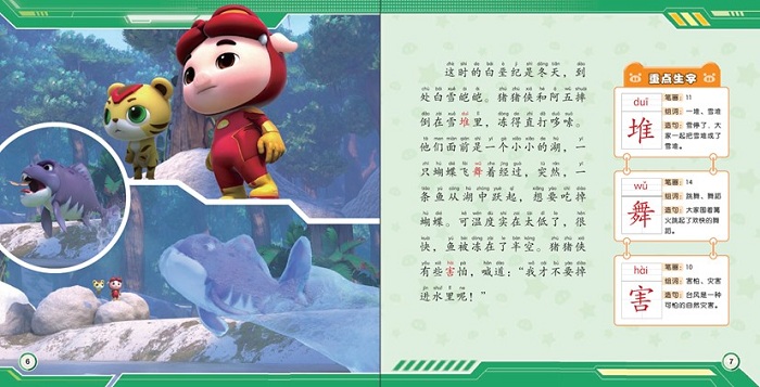 “猪猪侠之恐龙日记:拼音图画故事书” 精选热播动画片《猪猪侠之恐龙日记》中的8个故事进行改编,包括《霸王龙大战霸王龙》《疯狂的阿马加龙》《伪装大师伊森龙》《捉迷藏高手镰刀龙》4册,将探险故事与科普知识巧妙融合,为孩子们打造边玩边学的阅读模式,为孩子们打开一幅精彩的史前科普画卷。 《疯狂的阿马加龙》是该丛书的分册之一,包括《疯狂的阿马加龙》和《只有一根爪子的恐龙》两个动漫故事,所讲故事不仅趣味性强,而且有科普知识和益智游戏找不同,寓教于乐,满足孩子的求知欲,帮助孩子提高语言能力、思维能力和注意力等。