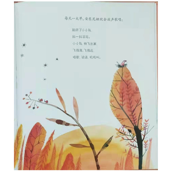 这是一本适合3—6岁儿童阅读的图画书。每天清晨,安东尼娅都会用歌声叫醒森林里的其他小鸟,但大家都觉得她太吵了。不被理解的安东尼娅伤心地飞走了……没有安东尼娅的森林冷清了不少,总是睡过头的小鸟们渐渐意识到了安东尼娅原本的好意…… 书中的安东尼娅就如同一个不太自信的小孩儿,在与其他小鸟相处的过程中,安东尼娅学会了用智慧解决问题,重拾自信,勇敢地做回了自己。而森林中其他鸟儿对安东尼娅的态度转变,让他们懂得了宽容与理解,学会用包容的心接纳他人的不同,拓宽了自我认知的边界,收获了快乐和友谊。