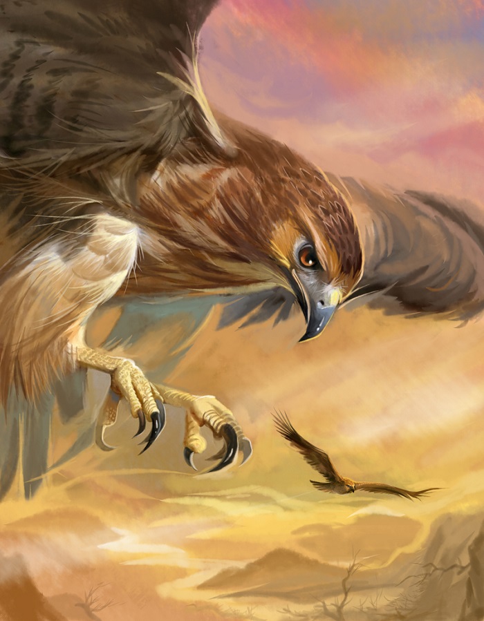 雄鹰金闪子 什么都逃不过金闪子的眼睛。鹰眼是世界上锐利的眼睛,在几百米高的天空翱翔,一眼就能看见在茂密草丛中惊慌逃窜的灰兔。所以当一片黑影贼头贼脑从一朵蘑菇状乌云里飘出来时,金闪子随意瞥了一眼,便认出来者不仅是同类还是同性,不由得心头陡地一紧。同性相斥,这条原理在鹰类中属于至理名言。在老鹰世界里,没有同性朋友这个概念。鹰是食肉猛禽,孤独的强者,习惯独来独往。雄鹰又是领地意识很强的猛禽,陌生雄鹰光临,目的只有一个,就是来争抢领地。金闪子拍拍强劲的双翼,爪子在岩石上磨砺了几下,沙沙沙,就像人类的磨刀霍霍,透出一片杀机。 陌生鹰越飞越近,在离金闪子筑巢的那棵云南松约两百米的天空盘旋。 金闪子看得更清楚了,来犯者屁股周围长着一圈雪白绒羽,给这家伙起名白羽臀是很贴切的。再仔细打量,这家伙嘴喙呈半透明琥珀色,脚杆粉红,翅膀上那层淡黄的毫毛还未褪尽,一看就知道是只初出茅庐的年轻雄鹰。金闪子悬吊的心放了下来。它鸟龄四岁,对老鹰来说,如日中天正值生命的;它是捍卫自己神圣的领地,而对方是非法入侵者,心理上它就占了上风;它的嘴喙更犀利,它的爪子更老辣,它的格斗经验更丰富,毫无疑问,力量对比它占有优势。它一定能赢得这场领地保卫战,成功地将来犯者驱赶出去。金闪子颈毛耸立,鹰眼射出两道凶光,恶狠狠长啸一声。这绝非先礼而后兵,动物界不讲究虚假的客套。这是一种威慑,一种恫吓,一种心理战术。随后,它双腿在岩石上一蹬,摇扇翅膀飞了起来。它迎着强劲的山风飞翔,双翼像鼓胀的风帆,忽而扶摇直上,忽而流星般坠落,颉(xié) 颃(háng)翻飞,两只鹰爪指关节嘎巴嘎巴响,夸张地做出撕抓攫捏的动作。它绝非虚张声势,不敢与白羽臀搏杀。底下这块草木茂盛食源丰富方圆百里的纳壶河谷,是它赖以生存的土地,与它的生命同等重要。捍卫领地,就是捍卫自己的生存权益,它不惜流尽自己后一滴血。事实上,自打它在悬崖间那棵枝繁叶茂的云南松筑巢一年多来,已发生过几十起陌生雄鹰入侵事件。无论是狡猾的老年雄鹰还是强悍的中年雄鹰,它都毫无畏惧地以死相拼,赶走了一个又一个觊觎这块肥沃土地的野心家。它每战必胜,它怕谁呀。它之所以没立刻动手,说心里话,是希望能用威武的形象和威严的啸声,让白羽臀知难而退。