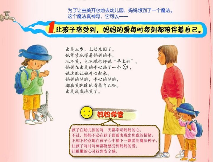 小女孩上幼儿园了,内向的她不主动跟老师打招呼,坐上校车也不开心。妈妈很担忧。小女孩到幼儿园之后,看到小朋友在院子里玩,她不去。妈妈在家想:怎么改变这种状况呢?后来,妈妈想出来一个好主意。放学回家后,妈妈在小女孩的手心里画了一个笑脸,说,这是个幸运符,可以让她什么事情都做得很好。第二天,小女孩犹豫着和老师打招呼,虽然是怯怯的,却也比昨天进步了。到幼儿园之后,画画、吃饭、唱歌跳舞也很积极。但还是不到院子里和小朋友一起玩。后来,妈妈又给她画了一个哭脸,说,有时候人确实会不开心或者害怕,那就尽情哭一哭吧。小女孩终于变得开朗起来,和小朋友一起玩。日本知名的亲子共读绘本。将世间浓烈、真挚的爱意,浓缩在每一个暖暖的画面。在不经意的日子里,孩子无时无刻不在稚嫩而坚定地成长。