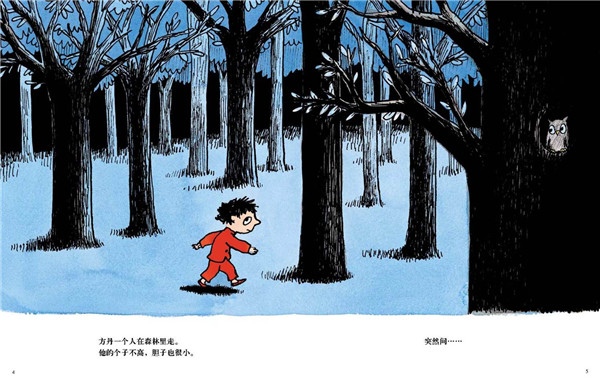 个子不高、胆子也很小的方丹,一个人在森林里走着。他好害怕啊,听到一声又一声让人畏惧的声音,也看到了一只又一只凶猛的野兽,他情急之下闯进了兔子的家,最后在兔子的帮助下,巧扮怪兽,安全地回到了自己的家。一场人生中重要的经历,就这般在游戏中完成,让悬着的心也安顿了下来。