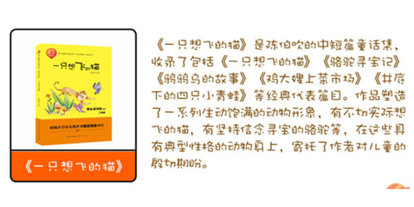《一只想飞的猫》是陈伯吹的中短篇童话集,收录了包括《一只想飞的猫》《骆驼寻宝记》《鸦鸦乌的故事》《鸡大嫂上菜市场》《井底下的四只小青蛙》等经典代表篇目。作品塑造了一系列生动饱满的动物形象,如不切实际想飞的猫、坚持信念寻宝的骆驼,在这些具有典型性格的动物身上,寄托了作者对儿童的殷切期盼。