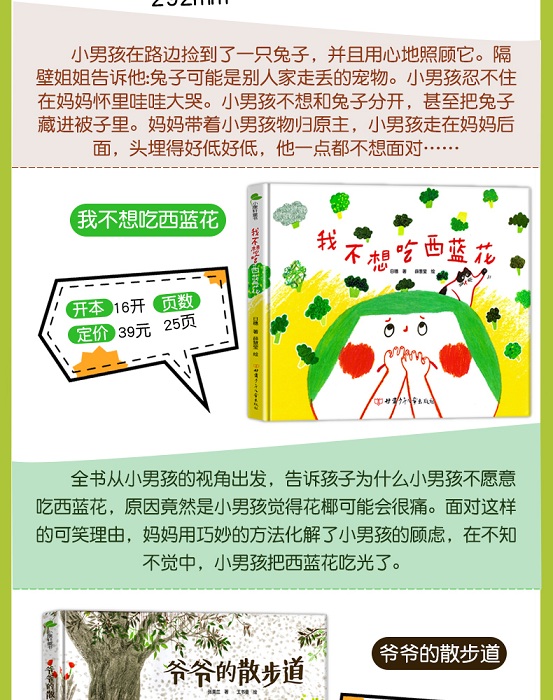 本书讲述了小男孩不想吃西蓝花的有趣故事,全书从小男孩的视角出发,告诉小读者为什么小男孩不愿意吃西蓝花,原因竟然是小男孩觉得花椰可能会很痛。面对这样的可笑理由,妈妈用巧妙的方法化解了小男孩的顾虑,在不知不觉中,小男孩把西蓝花吃光了。通过阅读本书,可以让小读者了解食物是怎么来的,怎么吃健康,最后引导小读者运用各种食材进行各种有趣、充满艺术性的创作。本书让小读者在获取知识的同时,还培养了阅读兴趣,让孩子终身受益。