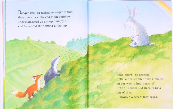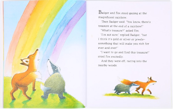 一个温情的故事让孩子学会珍惜朋友间的友谊用温柔的心去感知珍贵的宝贝也许就在你我身边“彩虹的尽头藏着宝贝”,一个莫须有的美丽传说吸引着獾和狐狸见到彩虹后,踏上了寻找宝贝的旅程。它们相继遇到了松鼠,它的宝贝是松果;遇到了鸭妈妈,它的宝贝是孩子;遇到了兔爷爷,它的宝贝是回忆。大雨来临,彩虹消失的时候,獾和狐狸终于找到了它们自己的宝贝,那是什么呢?