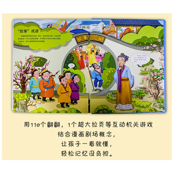 挑选小学阶段常见并要求掌握的近300个语近200个成语详解,近40个成语典故,为孩子的语文学习奠定基础。 用110个翻翻,1个超大拉页等互动机关游戏 结合漫画剧场概念,让孩子一看就懂,轻松记忆没负担。 孩子超感兴趣的翻翻形式,幽默活泼的插画,帮助 孩子积累语文素材,为孩子的语文学习奠定基础。 把每个成语化为一幅幅精美的幽默童画,一看就懂, 轻松记忆没负担。 覆盖各主题的成语:季节,气候成语,植物成语, 动物成语,颜色成语,数字成语,人物成语,故事成语 110个翻翻、1个超大拉页等互动机关游戏,结合漫 画剧场概念,生动有趣,帮助孩子更好理解知识。