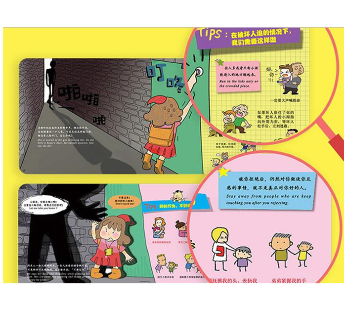 该系列图书分别从四个小朋友及其家庭的角度出发,从儿童的心理特点和理解能力考虑,围绕着户外活动安全、防诱拐、性侵、公共场所、学校安全等主题,多个主要的生活场景,以双语绘本的形式讲述了很多小主人公遇到的问题,每个问题的出现,都伴有解决方案和相关的知识点引申,语言和思考特点充分考虑小朋友的习惯,小读者能从中学会避开危险的人与事,遇险后保护自己的方法。