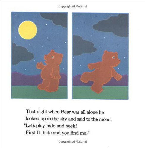 During a game of hide-and-seek, Moon hides behind a cloud,leaving his friend Bear very worried.Bear's delight in a game of hide-and-seek with the moon turns todespair when he fears his friend is lost for good. Ages 4-8.