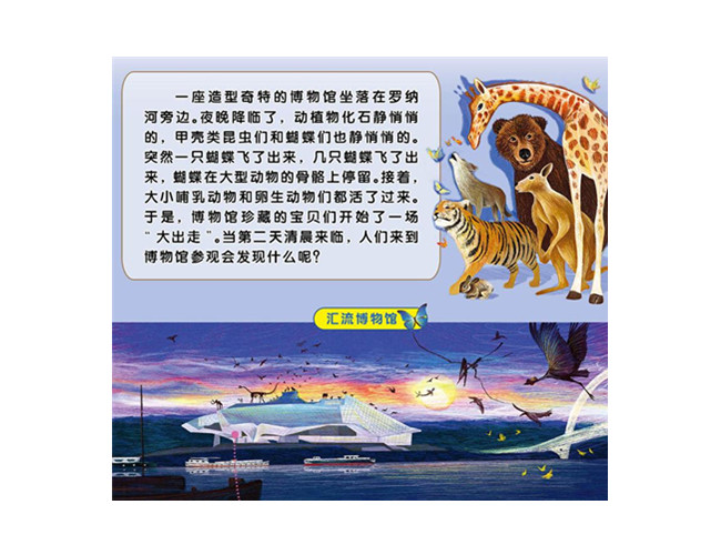 一个富有魔法魅力的故事,一座造型奇特的博物馆坐落在罗纳河旁边,博物馆以法国里昂博物馆为原型。夜晚降临了,动植物化石静悄悄的,甲壳类昆虫们和蝴蝶们也静悄悄的。突然一只魔法蝴蝶飞了出来,几只蝴蝶飞了出来,蝴蝶在大型动物的骨骼上停留,对这些化石们施以魔法。接着,大猩猩、大象、猴子等各种大小哺乳动物和卵生动物们都随着蝴蝶的亲吻醒来了。于是,博物馆珍藏的宝贝们开始了一场“大出走”,他们聚在一起跳舞、狂欢,每个动物的动作都非常优美,像舞蹈一样。当第二天清晨来临,人们来到博物馆参观会发现什么呢?