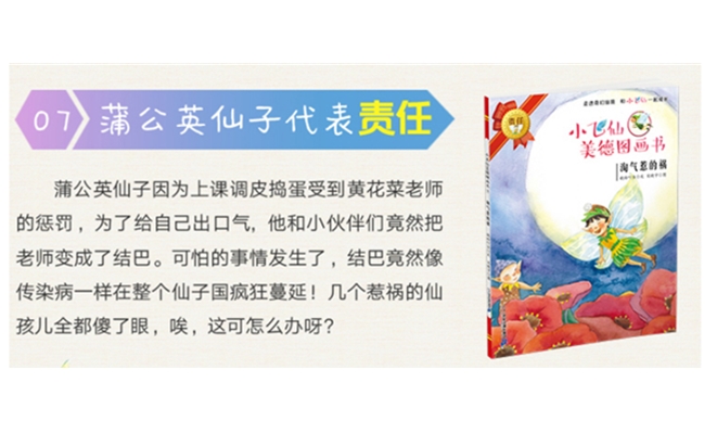 《小飞仙美德图画书》全系列共50册,第一辑推出1-10册。该系列以充满奇幻的笔调将人类本性中50 种美德:善良、诚实、勇敢、谦逊、勤劳、尊重、责任、宽容、乐观、感激……大规模、全方位地尽收笔尖,借助清新可读、构思灵巧的图画,把真善美的故事演绎得生动有趣,引导孩子们走向美好,传承美德。