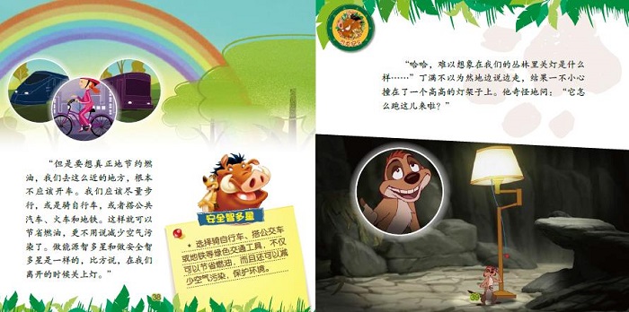 本套丛书共6册,主题分别是居家安全、身体安全、网络安全、环保安全、用火安全和安全玩水。除了普及传统意义上的安全知识外,还加入了“环保安全”这种近些年被广泛关注的、与生活息息相关的新的安全概念。教会孩子不仅关注自身,还能用发展的、前瞻性的眼光看待周围的世界。故事采用了迪士尼著名动画电影《狮子王》里的丁满和彭彭两个角色,讲述他们生活中的各种趣事。丁满性格大大咧咧,常常做出不安全的举动;彭彭性格谨慎稳重,总是适时提醒丁满,避免酿成大错。两个性格差异如此之大的好朋友总是火花不断,但也在笑笑闹闹中学会了安全知识。