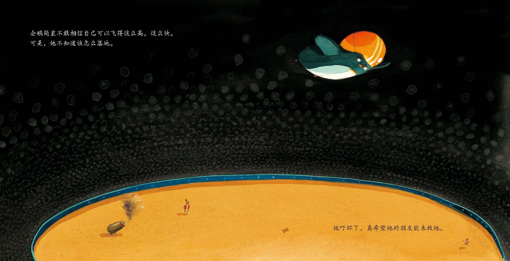男孩和企鹅是形影不离的好朋友,他们做什么事情都喜欢在一起。可是在企鹅的心中一直有个梦想:他想成为一只可以飞的企鹅。为了帮助自己的小伙伴实现梦想,小男孩帮助企鹅想了很多的方法,可是书上说企鹅是不能飞起来的。失望的小企鹅发现了马戏团在招募大炮演员,觉得这样就可以飞上天。兴奋的小企鹅一个人去了马戏团……他的梦想成真了吗?