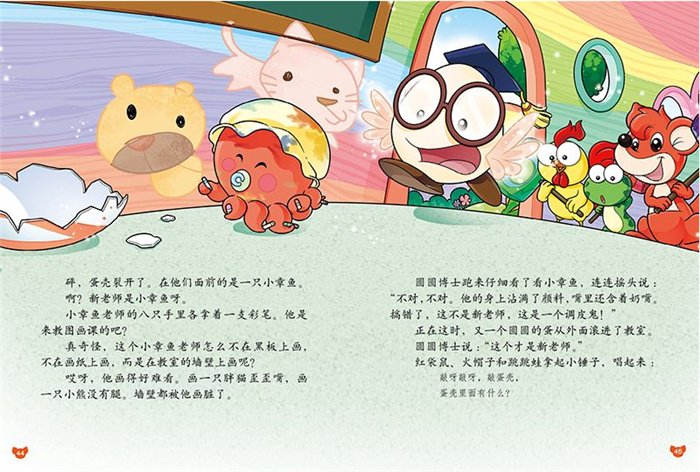 蛋壳学校可真是一个神奇的地方。在这里,每天都发生着新鲜、刺激又好玩的事情。进教室要走蜗牛滑梯,小朋友背上能长出翅膀,鞋子能变成气垫船,小树能长出图画纸,小鸟的身体能变形,可以在眼泪河里玩冲浪,可以变成小伞兵采花蜜,泡泡船载着大家飘呀飘,小潜艇带着大家遨游大海,还有神奇的萝卜火箭、蛋壳里的鸡毛信、夜空中的尾巴灯、让人惊叹的百变蛋壳……