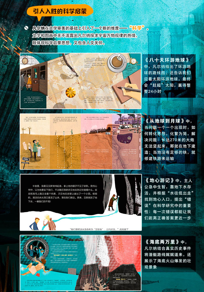 由国际儿童读物联盟获奖者、希腊国家绘本奖得主艾丽斯·萨玛尔茨创作,以绘本式的图文关系精准展现凡尔纳作品“浪漫、乐观、热情、明亮”的特质。她将插画与真实的历史照片、手稿、路线图等巧妙结合,仿佛百年前的历史背景、重大事件、故事传说历历在目,身临其境。