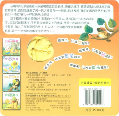 一只巨嘴鸟瞧着自己的嘴巴,有些不开心:“我的嘴巴这么大,一点儿不灵巧;我的嗓音比不上喜鹊美妙,也不像啄木鸟的嘴巴功劳高。”正当他闷闷不乐的时候,一只鹈鹕鸟飞近他的身旁……小朋友你瞧,即使巨嘴鸟有不如别人的地方,但他也不沮丧,因为每一只鸟都有不完美的地方,它并不影响我们和好朋友快乐歌唱!