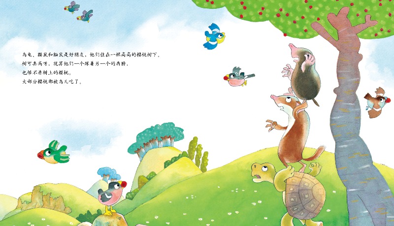 乌龟、鼹鼠和鼬鼠在樱桃树底下捡到一颗蛋,蛋里面到底是什么呢?三个小伙伴本来打算吃掉蛋里孵出的小鸟,但是,随着相处的时间越来越长,他们和小鸟成了好朋友,小鸟还经常衔着樱桃,给三个小伙伴吃呢。