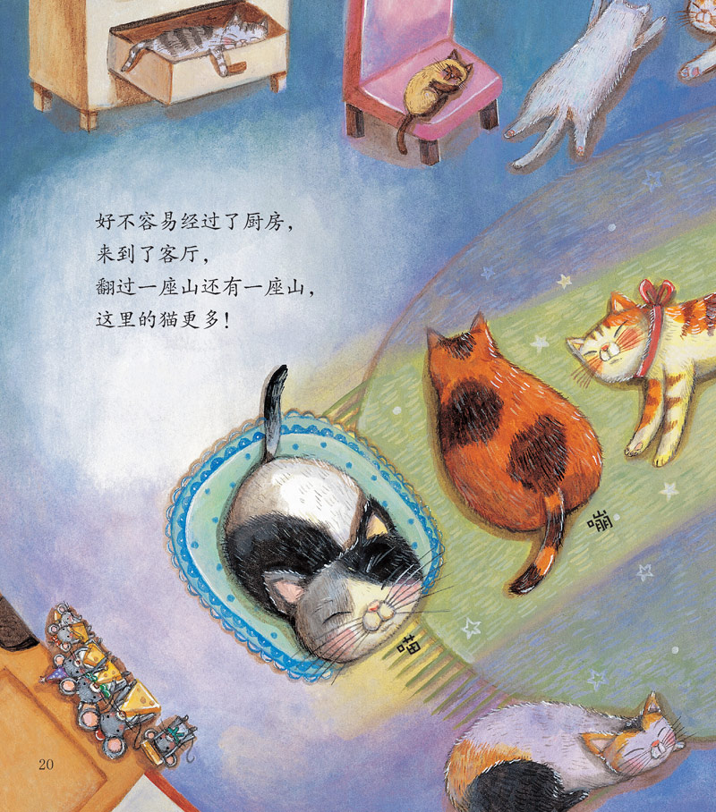 喵喵猫的胡子长长的,嘣嘣猫放屁“嘣嘣嘣”的,尖尖猫的爪子尖尖的。小老鼠们要想从猫群里穿过,拿到好吃的起司,该按什么样的规律走呢?小老鼠能找到猫咪排列的规律,搬走好吃的起司吗?