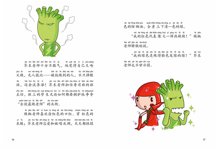 辣椒老师喜欢涂红色的口红、穿红色的衣服;芥末老师总爱和她唱反调,天天都抹绿色的防晒油,全身上下清一色的绿。